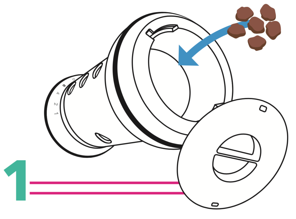 - After removing the cover (grasp the cover a few degrees and turn anti-clockwise, then pull out the cover) located at one end of the PIPOLINO®-M , fill with half the PIPOLINO®-M with the usual dry food.